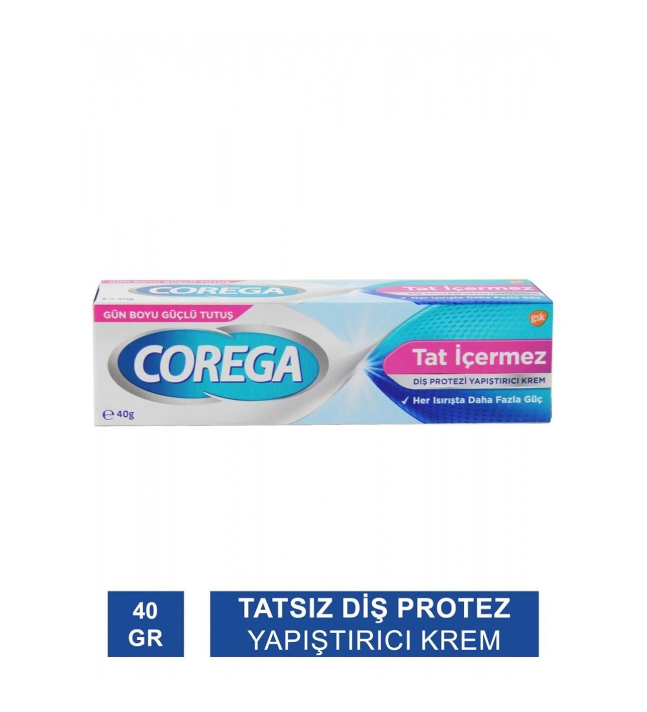 Corega Gün Boyu Güçlü Tutuş Diş Protez Yapıştırıcı Tat İçermez Krem 40 gr, diş protezlerinin gün boyu güvenle sabitlenmesini sağlayan, tat içermeyen özel formülü ile yiyeceklerin doğal tadını koruyan bir üründür. Özellikle tat hassasiyeti olan kullanıcılar için idealdir.