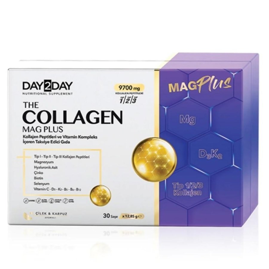 Day2Day Collagen Mag Plus, hidrolize kolajen, magnezyum, C vitamini, hyaluronik asit ve çinko içeren gelişmiş bir formüldür. Cildin elastikiyetini artırmaya, kırışıklıkların görünümünü azaltmaya ve saç ile tırnakları güçlendirmeye yardımcı olur. Aynı zamanda magnezyum desteği ile kas ve eklem sağlığını destekler.