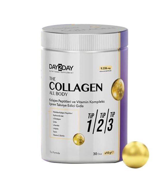 Day2Day The Collagen All Body Toz 10 gr 30’lu, cilt, saç, tırnak ve eklem sağlığınızı desteklemek için geliştirilmiş premium bir kolajen takviyesidir. Pratik paketler halinde sunulan 10 gr’lık porsiyonları sayesinde günlük kullanım oldukça kolaydır.