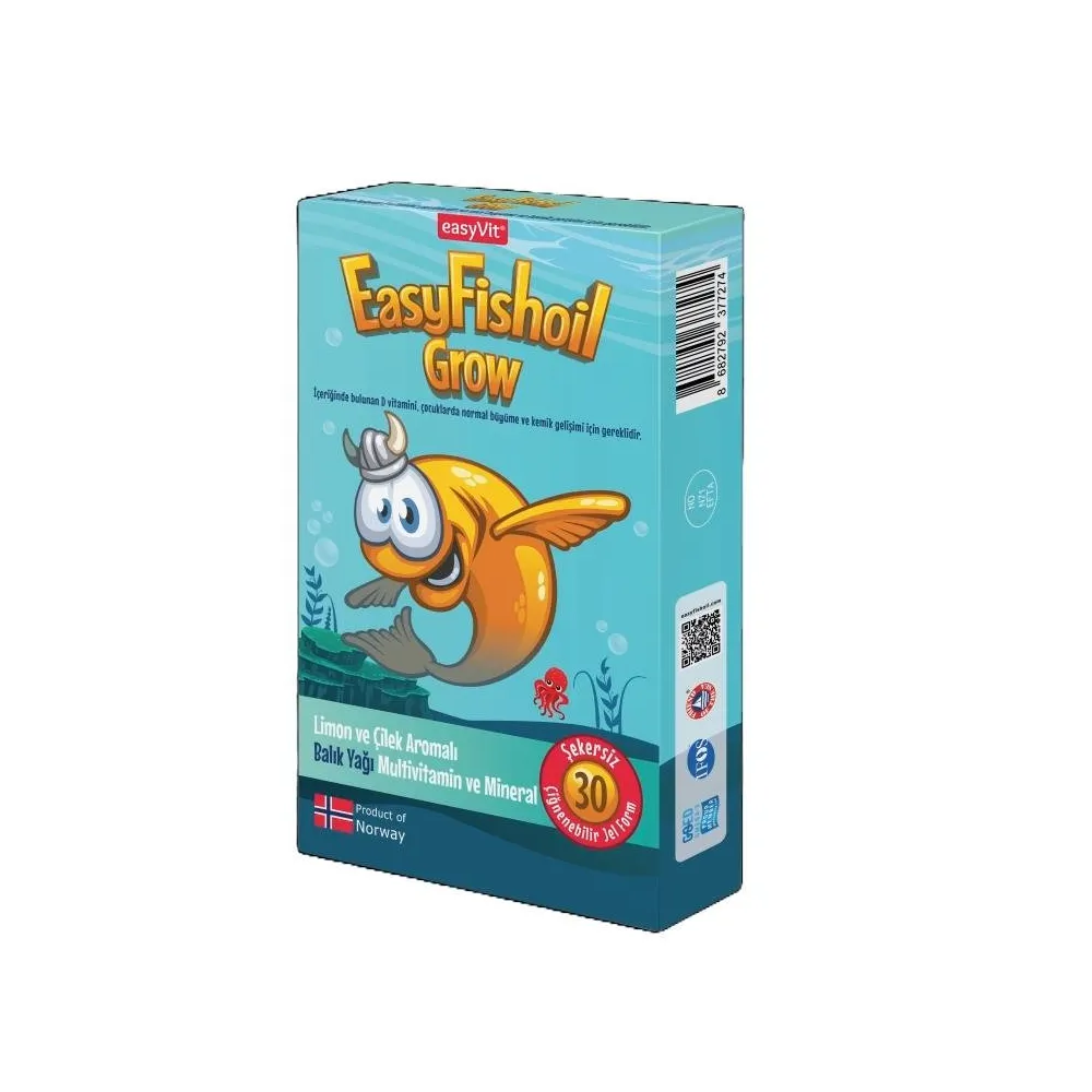 EasyFishoil Grow Çocuk, çocukların sağlıklı büyüme ve gelişimini desteklemek için geliştirilmiş, Omega-3 (DHA & EPA), D vitamini, K2 vitamini ve çinko içeren çiğnenebilir takviyedir. Lezzetli aroması sayesinde çocuklar tarafından severek tüketilir.
