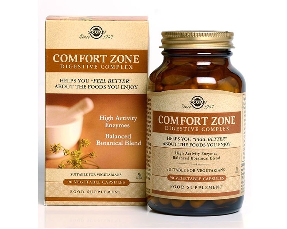 Solgar Comfort Zone Digestive Complex 90 Kapsül, vücudun doğal sindirim sürecini desteklemek için özel olarak formüle edilmiş bitkisel enzim karışımı içerir.