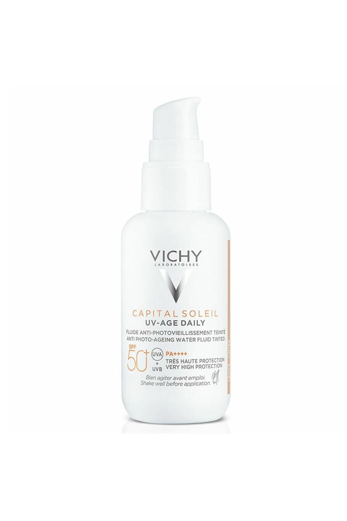 Vichy CS UV Age Daily Tinted SPF50, cildi güneşin zararlı UVA ve UVB ışınlarından korurken, günlük kullanımda eşit ve aydınlık bir cilt tonu sağlayan renkli bir güneş kremidir. SPF50 yüksek koruması ile cilt yaşlanmasını ve leke oluşumunu önlemeye yardımcı olur. Hafif, hızla emilen ve yapışkan olmayan formülü sayesinde tüm cilt tipleri için uygundur. Düzenli kullanımda cilt daha pürüzsüz, nemli ve sağlıklı bir görünüm kazanır.